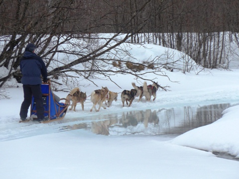 Journée entière (5 heures) de balade en forêt avec attelages de huskies, 2 personnes/traîneau. Chacun pourra s'essayer à la conduite de l'attelage.